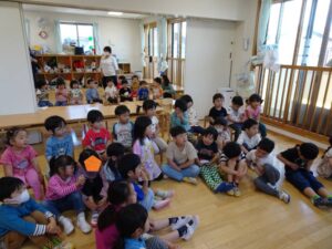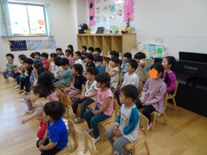 うさぎ組さんかららいおん組さんのお友だちが集まり、子どもの日についての由来を一緒に学びました。ぞう組のお友だちはみなさんとても真剣にお話を聞いています…さすがぞう組さんです…