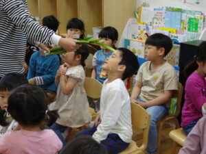 ↑菖蒲の葉も紹介し、五感で感じながら菖蒲の葉を使った端午の節句の風習を教えてもらいました。