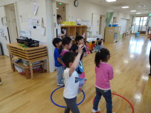 集会の前にうさぎ組さん、ぱんださん、らいおん組さんで朝の集いを行いました…
