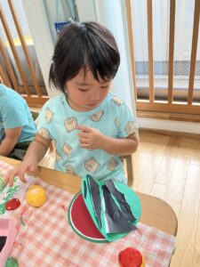 夏らしく、すいかの製作とみんなが興味のある、かぶとむしとくわがたの製作をしました!
