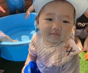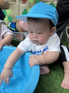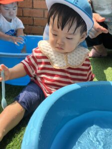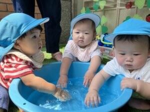 0歳児クラスの子どもたちは水遊びをたっぷり楽しんでいます!