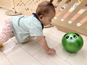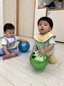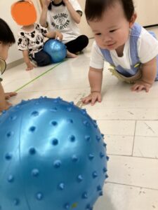 転がるボールを目で追いかけ、ハイハイで一生懸命追いかけたり、両手で持って「えいっ!」と投げようとしたりと、それぞれの発達に合わせて体をたくさん動かす姿が見られました✨