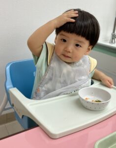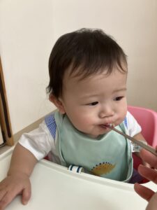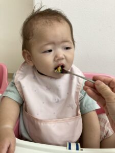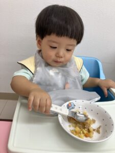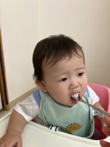 スプーンを持って食べようとする姿や、「おいしいね」と言わんばかりににっこりと笑う姿も見られ、食べることへの意欲がぐんと育っているのを感じます✨