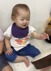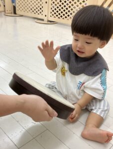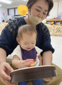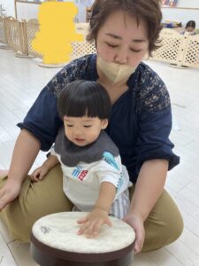 最後は、講師の先生のお膝に座って一緒に太鼓をトントン♪