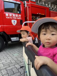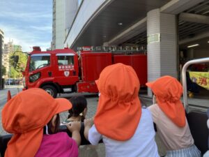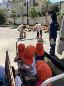 消火訓練では、先生たちの動きをよく見て、集中して観察をしていました✨先生たちが消火訓練を終えると「パチパチパチ👏」と拍手をしてくれる姿や消防士さんが訓練をしている所を見学し、みんな釘付けで見ていました😊
