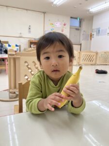 栄養士さんが「この果物なんだ?」と聞くと、「バナナ🍌」「オレンジ🍊」「りんご🍎」と元気に答えていました✨