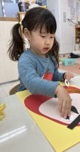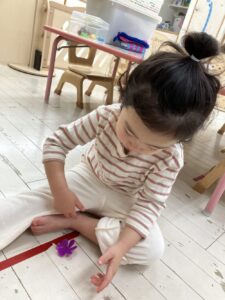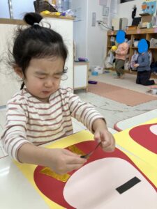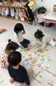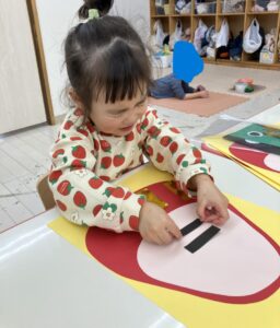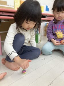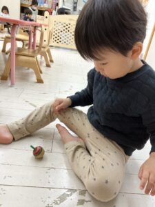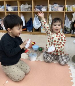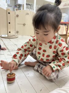 そんな年始めの今週はお正月遊びを楽しみました。コマにカルタに福笑い、おままごとにはお餅も登場し、ぺったんぺったんと手遊びをしながらお料理している様子を紹介します💗