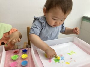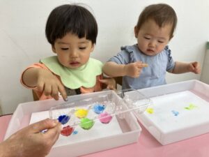 色が広がっていく様子をじっと見つめてたり、そっと触れてみたりと、それぞれが色の変化を楽しみながら取り組む子どもたちでした🎨✨