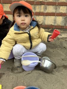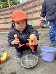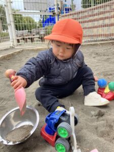 お山を作っていると、「○○もい~れ~て~!」「おすなもってくる!」と