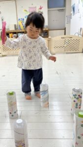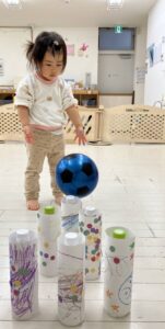 出来上がったらペットボトルに貼り、ボーリング&輪投げ大会😆